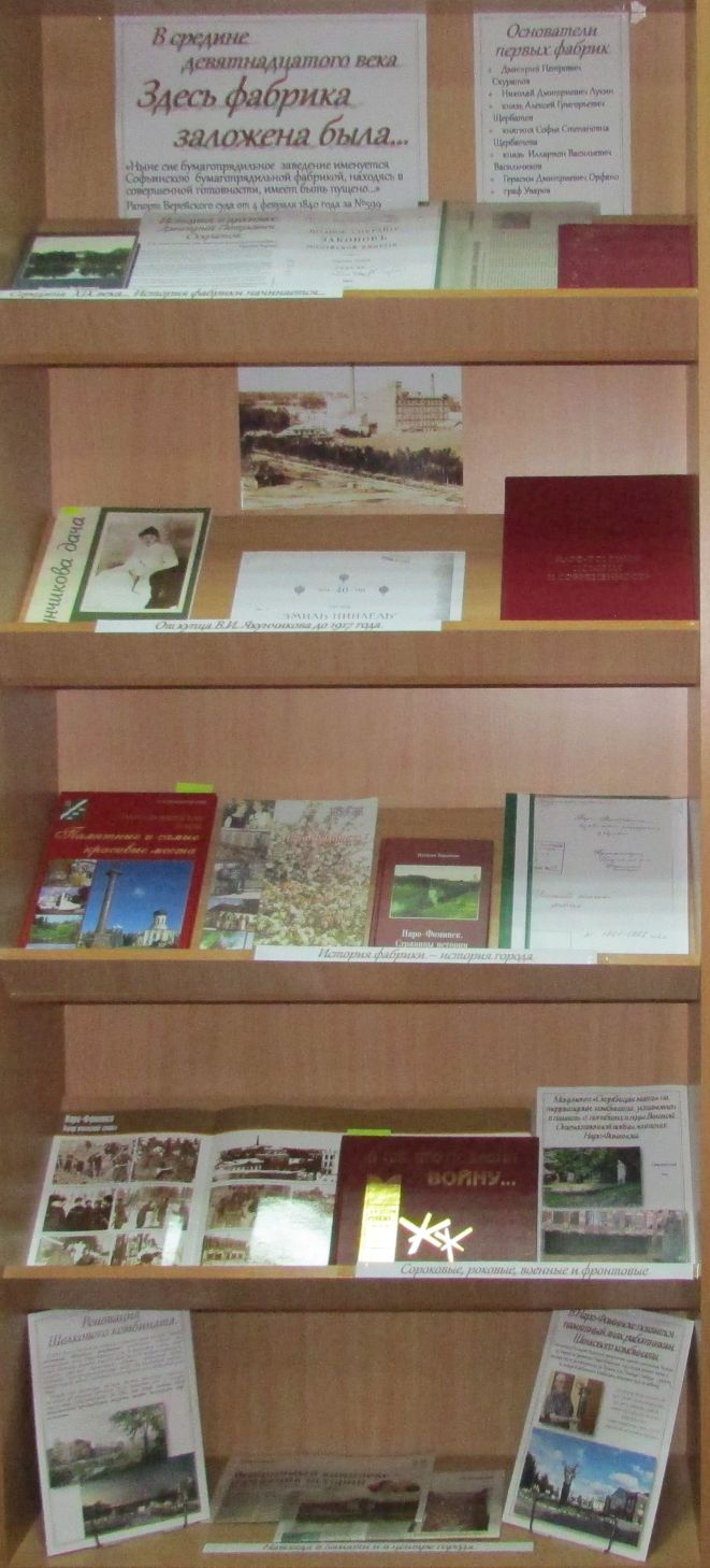 Читателям предложены книги и статьи из газет «Основа» и «Центр Города» наро-фоминских краеведов Л.В. Дубининой, Н.Р. Хорошевой, Т.А. Окуловой, Г.С. Чупыриной, Ю.В. Комаровского и В.Ю. Ипатова; архивные документы, подготовленные специально для этой выставки наро-фоминским архивом, копии документов середины XIX века.