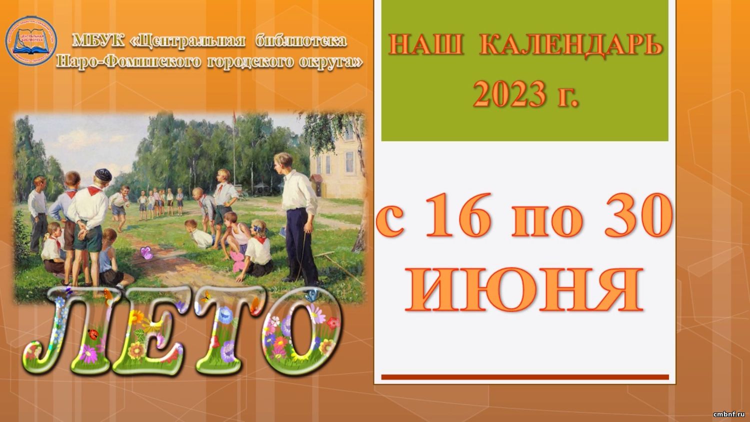 Представляем вашему вниманию «Наш календарь» знаменательных и памятных дат с 16 по 30 июня, подготовленный И. А. Лукьяновой - библиографом информационно-библиографического отдела.