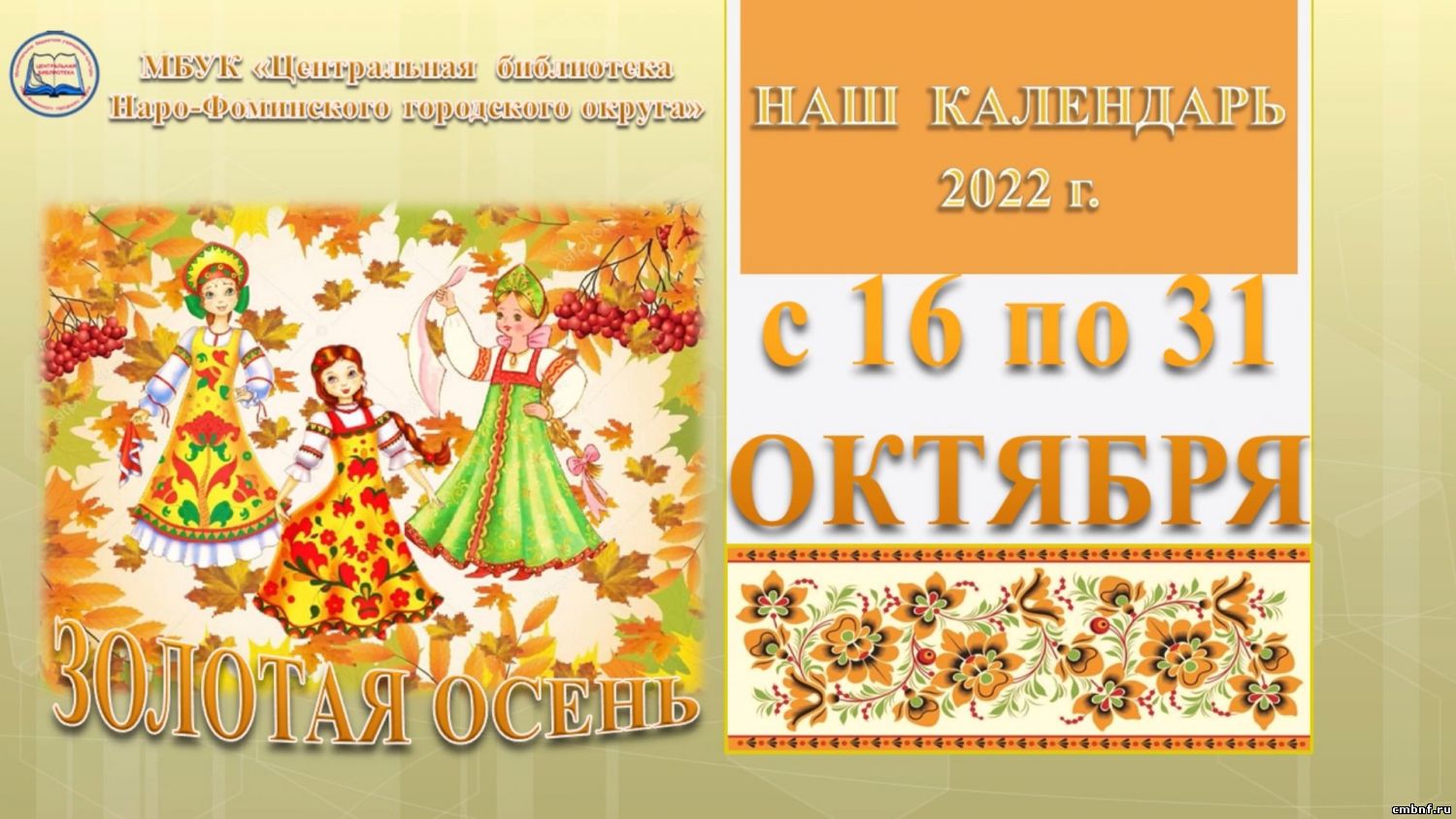 Представляем вашему вниманию «Наш календарь» знаменательных и памятных дат с 16 по 30 октября, подготовленный Лукьяновой И.А. - библиографом информационно-библиографического отдела.
