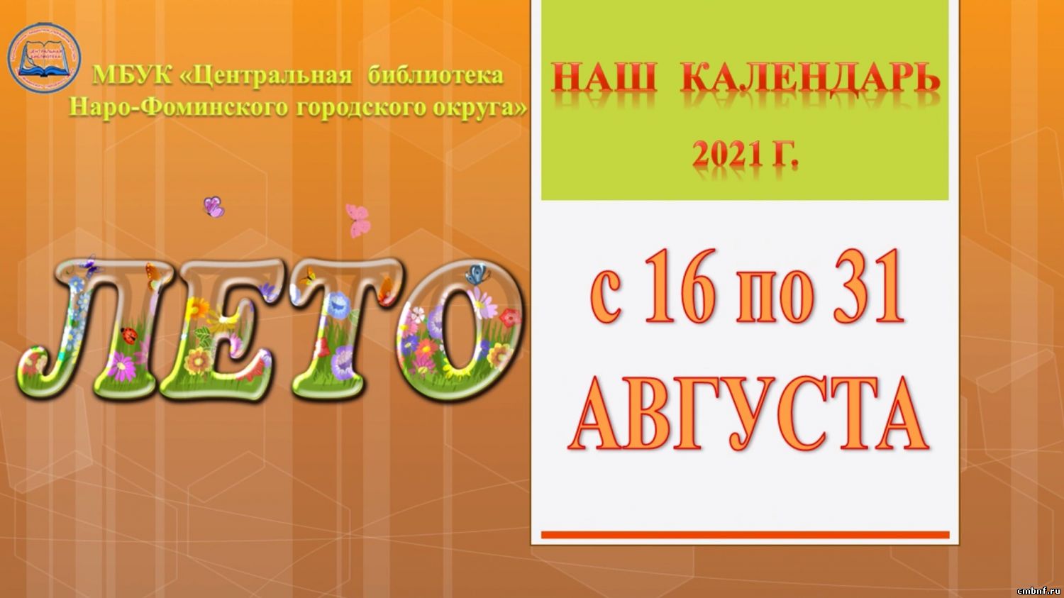 Представляем вашему вниманию «Наш календарь» знаменательных и памятных дат с 16 по 31 августа, подготовленный Лукьяновой И.А. - библиографом информационно-библиографического отдела.