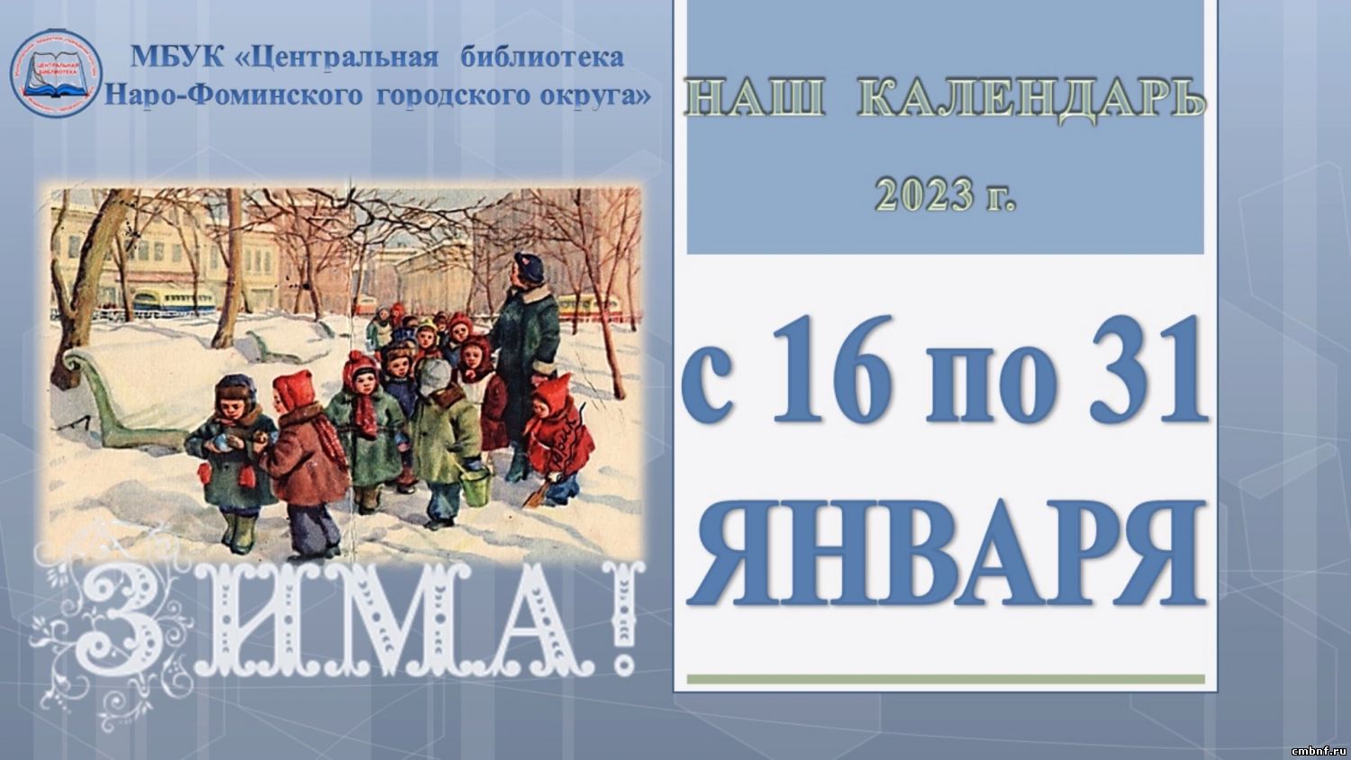 Представляем вашему вниманию «Наш календарь» знаменательных и памятных дат с 16 по 31 января, подготовленный Лукьяновой И.А. - библиографом информационно-библиографического отдела.
