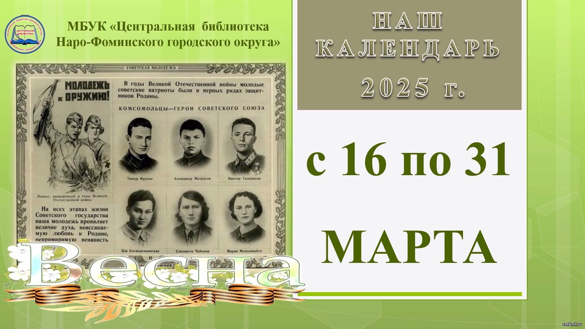 Представляем вашему вниманию «Наш календарь» знаменательных и памятных дат с 16 по 31 марта 2025 года, подготовленный ведущим библиографом МБУК «ЦБ Наро-Фоминского городского округа» Ириной Лукьяновой.