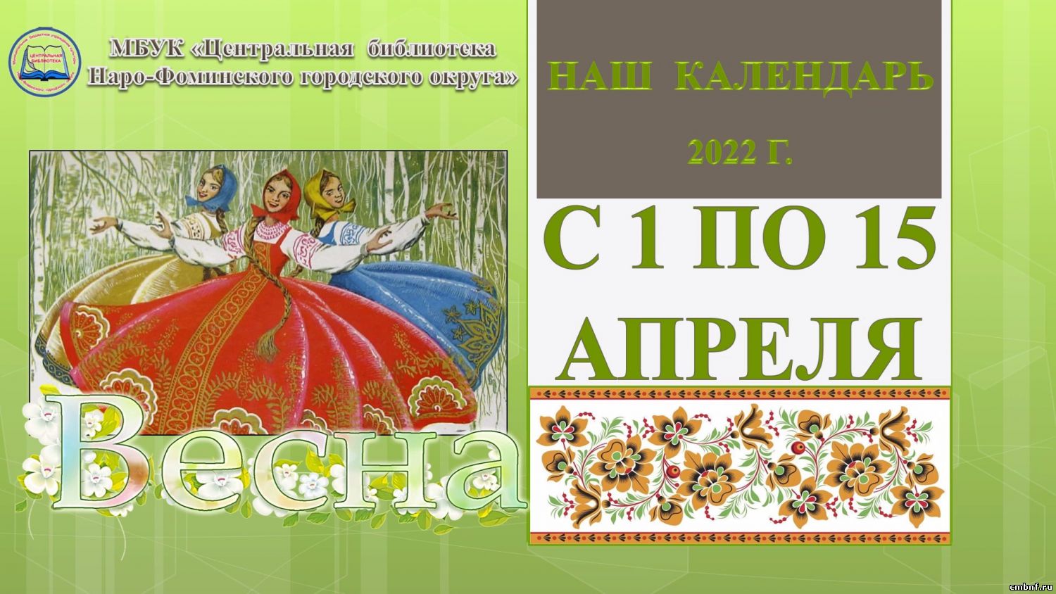 Представляем вашему вниманию «Наш календарь» знаменательных и памятных дат с 1 по 15 апреля, подготовленный Лукьяновой И.А. - библиографом информационно-библиографического отдела.
