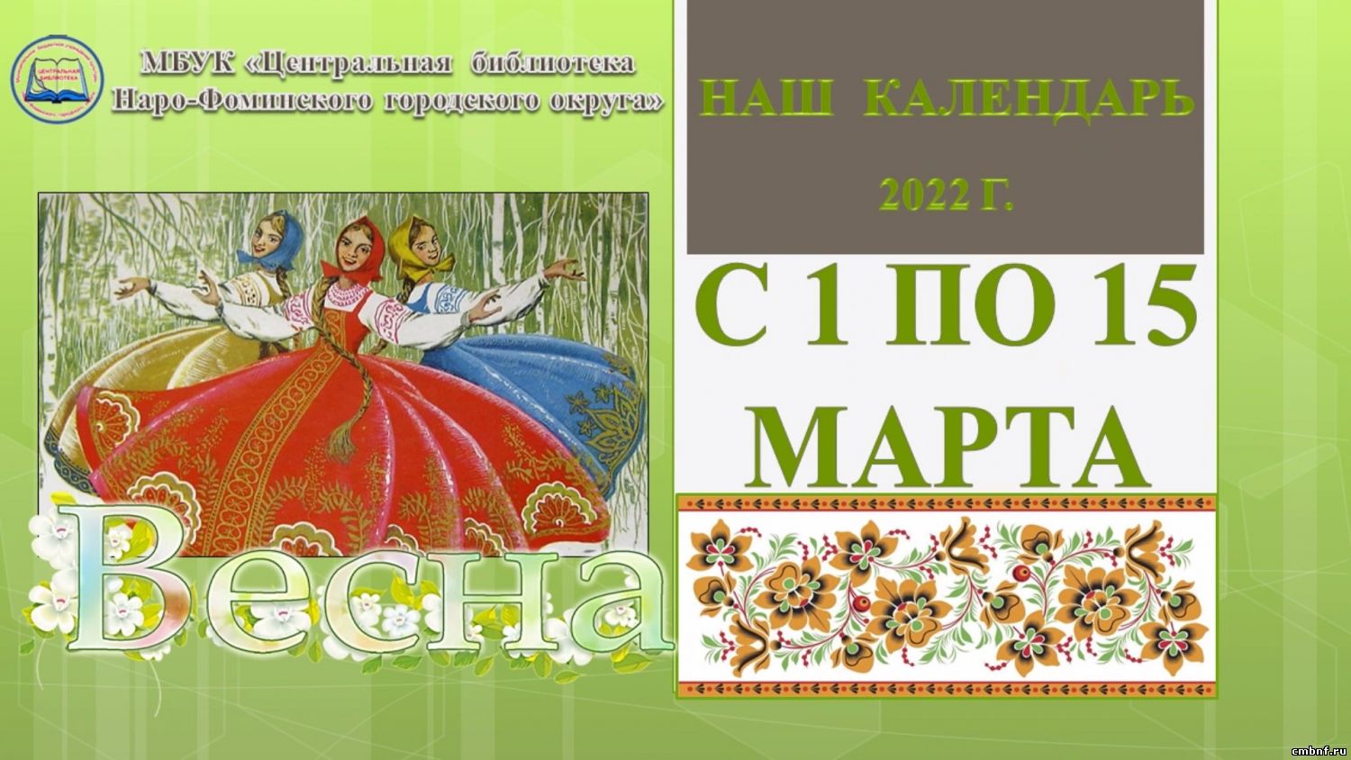 Представляем вашему вниманию «Наш календарь» знаменательных и памятных дат с 1 по 15 марта, подготовленный Лукьяновой И.А. - библиографом информационно-библиографического отдела.