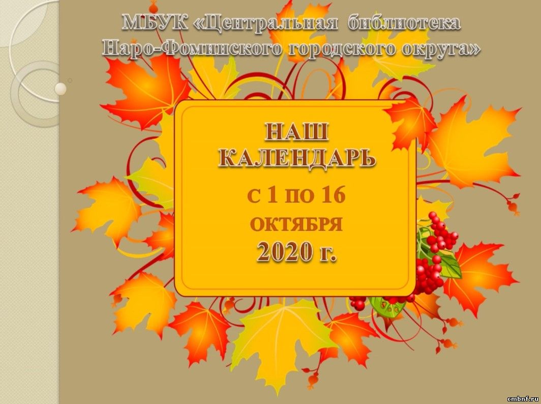 Представляем вашему вниманию календарь знаменательных и памятных дат с 1 по 16 октября, подготовленный Лукьяновой И.А., библиографом информационно-библиографического отдела.