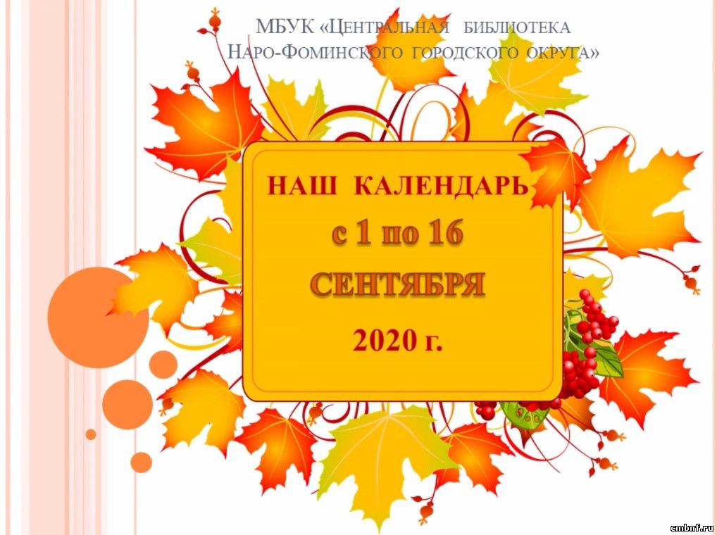 Представляем вашему вниманию календарь знаменательных и памятных дат с 1 по 16 сентября, подготовленный Лукьяновой И.А. - библиографом информационно-библиографического отдела.