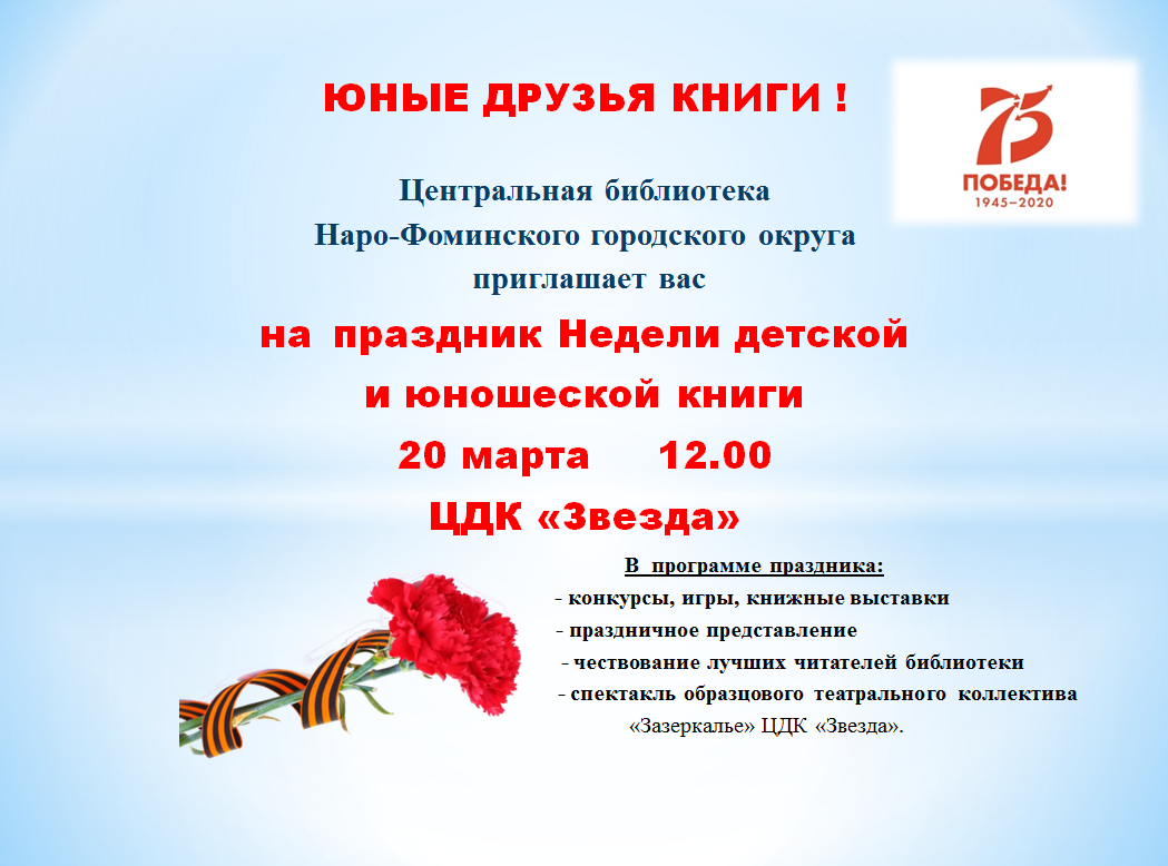 Центральная библиотека Наро-Фоминского городского округа приглашает вас на праздник Недели детской и юношеской книги
