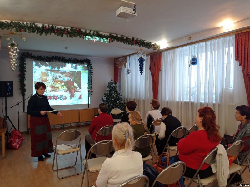 Поговорили о новогодних приметах и обычаях, рецептах праздничных блюд времён правления Петра I, а так же о традициях, дошедших до наших времен. Гости делились своими семейными историями встречи Нового года, вспомнили новогодние песни из кинофильмов и исполнили их сами.