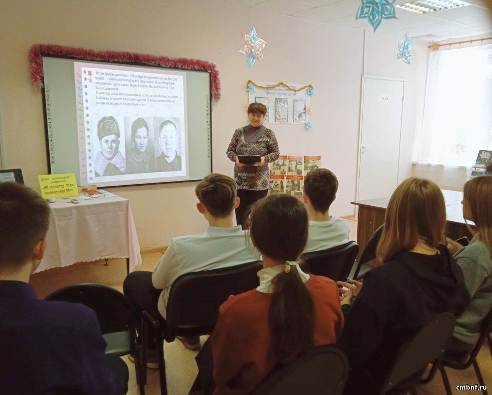 Библиотекарь Оксана Аксенова познакомила учащихся с подвигом героя Великой Отечественной войны Зои Анатольевны Космодемьянской.