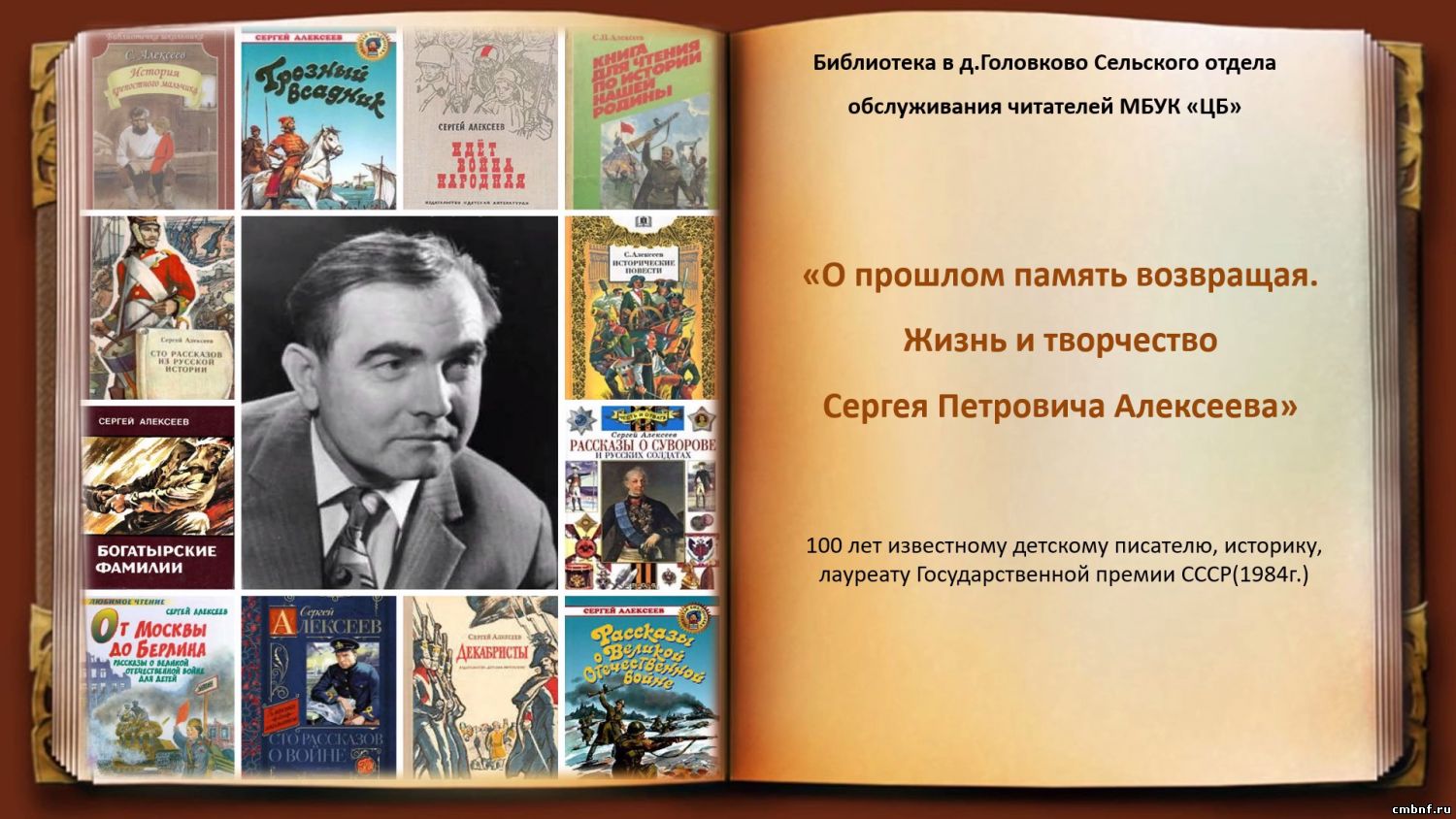 1 апреля 2022 года детскому писателю, историку, лауреату Государственной премии СССР, автору многочисленных произведений о русской истории Сергею Петровичу Алексееву исполняется 100 лет со дня рождения. К юбилею писателя библиотекарем сельского отдела обслуживания читателей в д.Головково Натальей Вечкаевой подготовлен литературный экскурс «О прошлом память возвращая. Жизнь и творчество Сергея Петровича Алексеева».