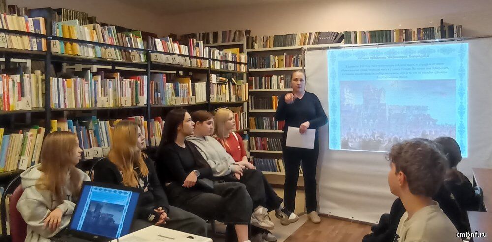 Библиотекарь подготовила для ребят презентацию и рассказ о большом празднике, который отмечает Православная церковь и все христиане. Присутствующие с интересом слушали об истории возникновения этого праздника, о традициях празднования Покрова нашими предками.