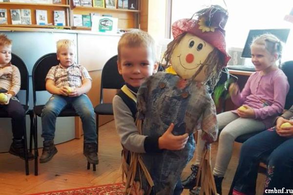 На прощание каждый ребёнок сфотографировался на память с Весёлым Огородным Пугалом и получил вкусное осеннее яблочко.