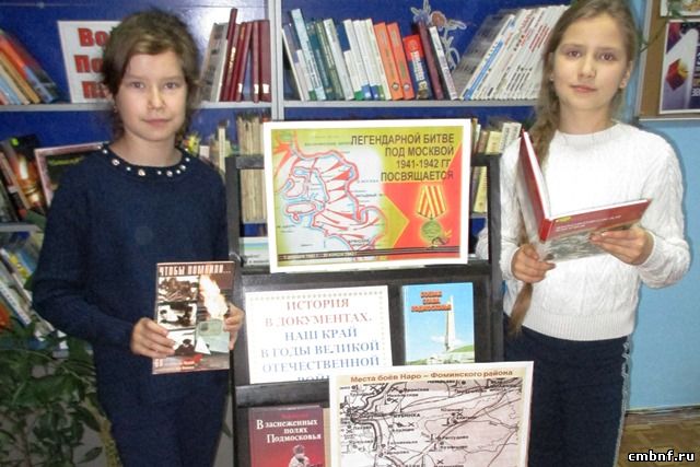 Декабрь - знаменательный месяц для наро-фоминцев. В декабре город был освобожден от немецко-фашистских войск. Поэтому, в эти дни мы вспоминаем Московскую битву, ее героические страницы. 6 декабря, в библиотеке п.Новая Ольховка прошел час мужества «Первый шаг к Победе». Ребята, посетившие библиотечное мероприятие, услышали, как развивались события под Москвой, в Наро-Фоминске, об этапах Московской битвы, о мужестве и стойкости защитников столицы, наро - фоминцах, принимавших участие в освобождении города; познакомились с книгами о земляках-героях. Рассказ библиотекаря сопровождался показом электронной презентации. Юные читатели с интересом познакомились с библиотечной выставкой «Легендарной битве под Москвой 1941-1942 гг. ПОСВЯЩАЕТСЯ», на которой были представлены книги из фонда библиотеки на данную тему.