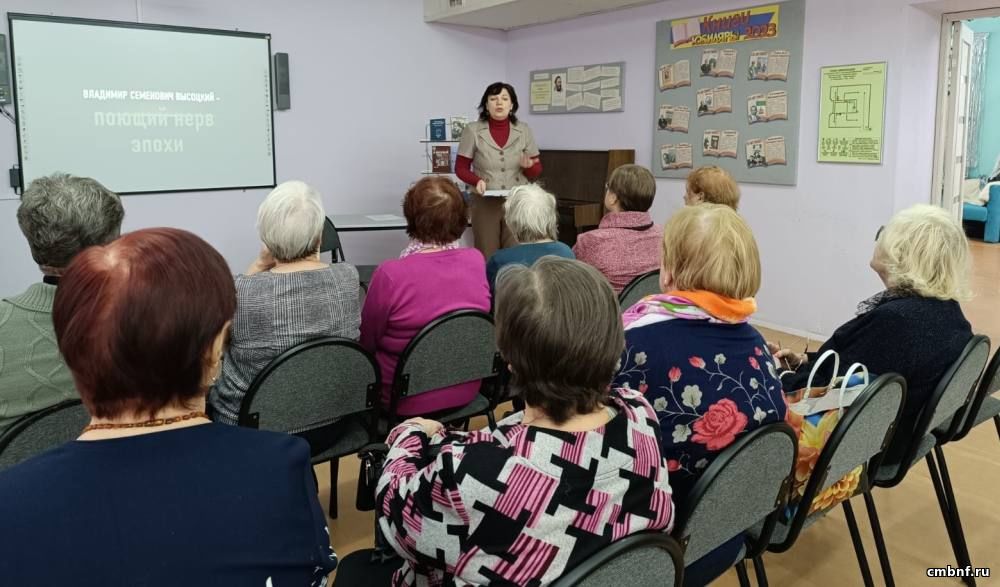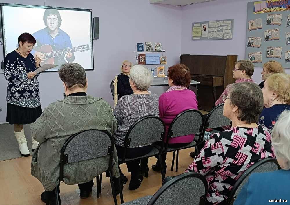 Библиотекарь отдела обслуживания читателей (ул. Латышская, д. 15б) Елена Щеблыкина пригласила участников сообщества «Активное долголетие» и Общества инвалидов для того, чтобы вспомнить песни и стихи В. Высоцкого, еще раз пройтись по страницам непростой биографии поэта, задуматься над событиями прошлых лет, повлиявших на ранний его уход из жизни, почитать неповторимые стихи и даже спеть песни.