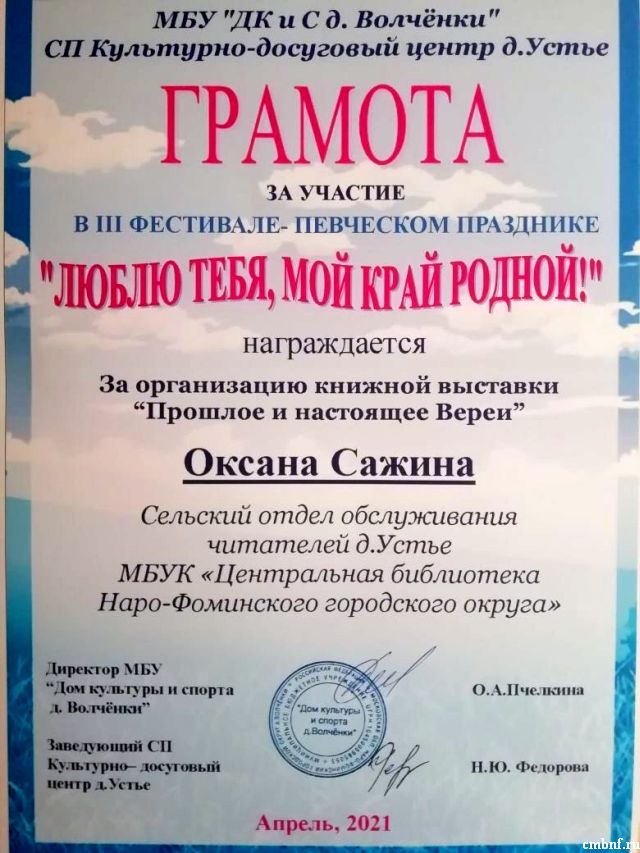 18 апреля библиотекарь д. Устье совместно с «ДК» провела мероприятие «Твоя строка в истории России», посвященное 650-летию города Вереи.
