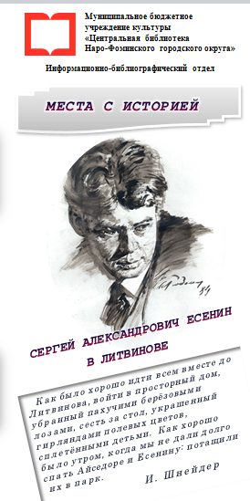 В этом году к юбилею всенародно любимого поэта в серии «Места с историей» информационно-библиографический отдел подготовил и выпустил буклет «Сергей Александрович Есенин в Литвинове». Когда и с кем Сергей Есенин приезжал в бывшую усадьбу князей Щербатовых, кто написал об этом в своих воспоминаниях, какие книги о С. Есенине и имении «Литвиново» из краеведческого фонда библиотеки мы рекомендуем прочитать – обо всём этом читайте в новом буклете.