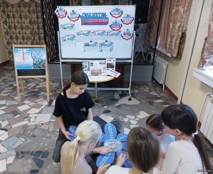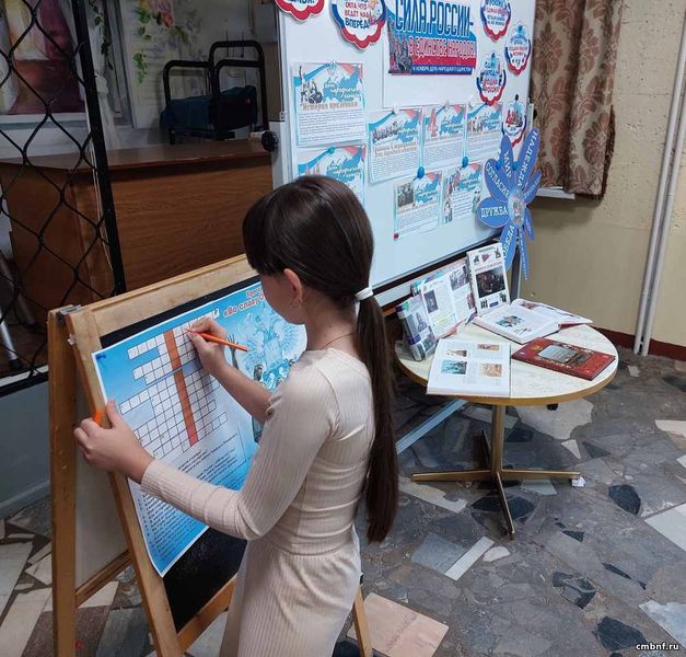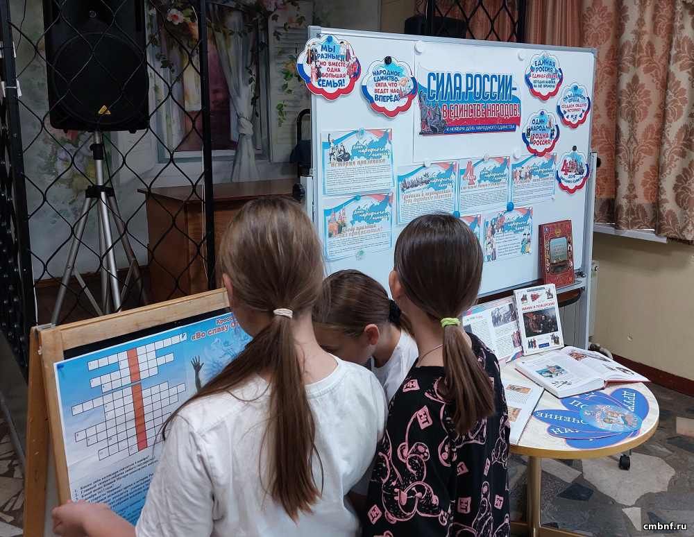 Юные посетили создавали Цветок Единства из мира, победы, дружбы, согласия, поддержи и сплочения! Вспомнили символы государства, отгадывали загадки и разгадали тематический кроссворд. К мероприятию была оформлена книжная выставка.