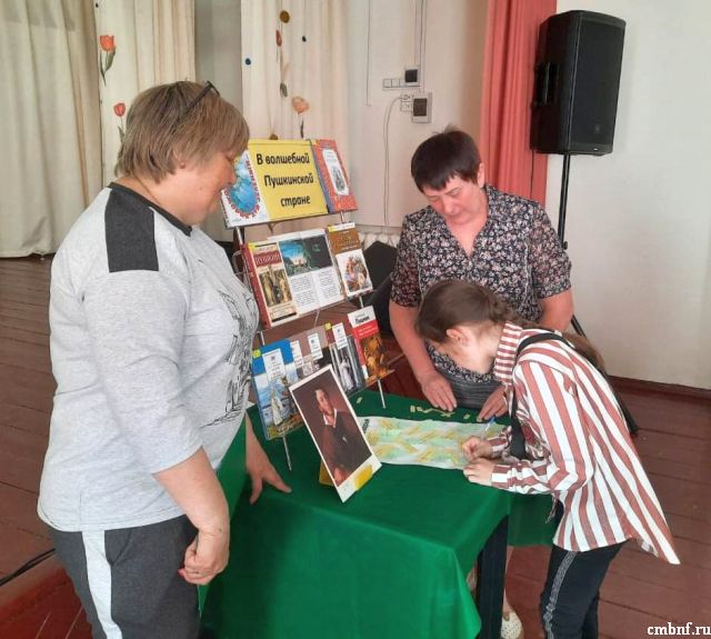 Сказочное путешествие «Тропинками лукоморья» в загадочный мир сказок Александра Сергеевича Пушкина совершили ребята в библиотеке д.Веселево. Ведущие с помощью презентации напомнили ребятам о жизненном и творческом пути великого поэта. Путешествуя по волшебным тропинкам Пушкинского Лукоморья, дети отвечали на вопросы викторины и составляли библиотечный квилт, приняли участие в конкурсах и играх «У самого синего моря», «В гости к Бабушке–Яге», «Златая цепь на дубе том…», «Сказочные Сокровища». В завершении путешествия юные любители поэзии читали любимые отрывки из сказок А.С. Пушкина