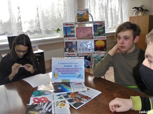 Во время проведения акции «День Российской науки в детских библиотеках Подмосковья» в отделе обслуживания читателей (ул. Латышская, 15б) побывало много читателей различного возраста. Для них были оформлены книжные выставки и стенды, посвященные этой дате. Ребята с удовольствием послушали информацию библиотекаря об истории праздника, активно добавляя в рассказ свои познания в этом. Много информации они знают и о создании Петром Первым Академии наук и художеств, впоследствии ставшей Российской Академией наук, которая дала всему миру множество уникальных имен и научных открытий.