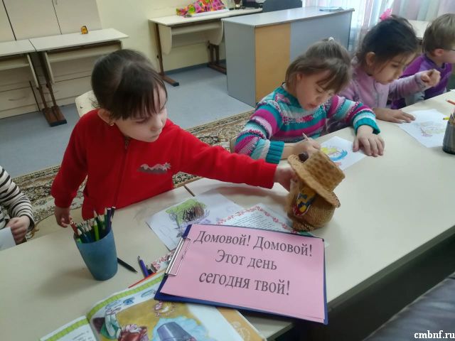 Узнали дети и про друзей Домового: Людоеда, Лешего, Кикимору, Бабу Ягу. Так как Домовенок любит пошуметь, решили сделать ему приятное - потопали, похлопали. Встречу завершили просмотром мультфильма про героя торжества.