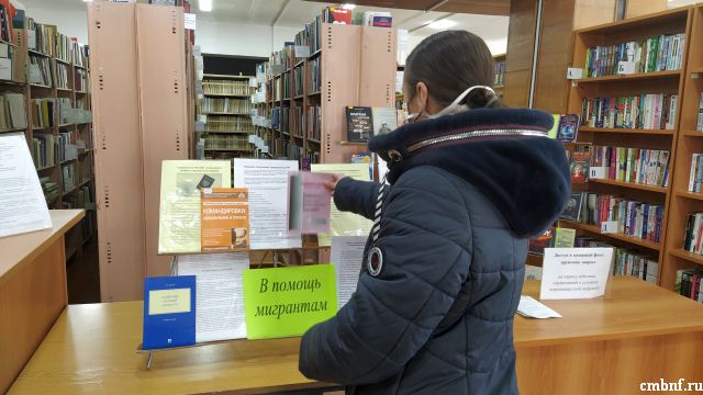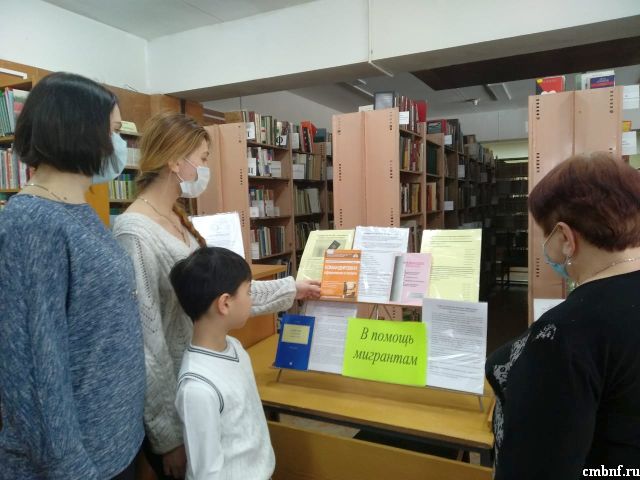 В рамках проведения комплекса мероприятий, направленных на социально-культурную адаптацию мигрантов и иностранных граждан, сотрудниками отдела обслуживания читателей был подготовлен информационный стенд «В помощь мигрантам». Библиотекари познакомили посетителей данной категории с базой данных «Консультант плюс», порталом «Госуслуги», сайтом Администрации города Наро-Фоминска и другими необходимыми ресурсами.