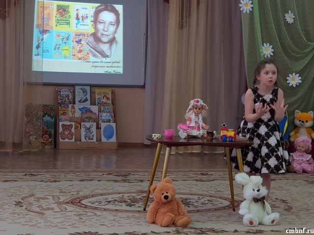 Уже много поколений читателей начинают знакомство с художественной литературой со слов «Наша Таня громко плачет…». И стоит только произнести эти слова, как каждый ребёнок и каждый взрослый тут же продолжит «…Уронила в речку мячик». Вот и ребятишки выучили все стихи из серии «Игрушки». И не только выучили, но и обыграли их как настоящие артисты. В их исполнении прозвучало много шутливых и поучительных стихотворений («Вовка - добрая душа!», «В школу») и озорных песенок о детских шалостях и проказах. А библиотекари Цепкова М.М. и Саломатина М.П. рассказали дошколятам о том, каким человеком была Агния Львовна Барто. О том, что её всегда волновало как живут дети, совсем маленькие и постарше. Умеют ли быть верными в дружбе? Не ссорятся ли по пустякам? Помогают ли старшим? Любят ли читать, учиться? Каждое её стихотворение – какой-то факт детской жизни. Талант поэтессы отмечен многими орденами и медалями. Стихи Агнии Барто переведены на 72 языка и печатаются в разных странах!