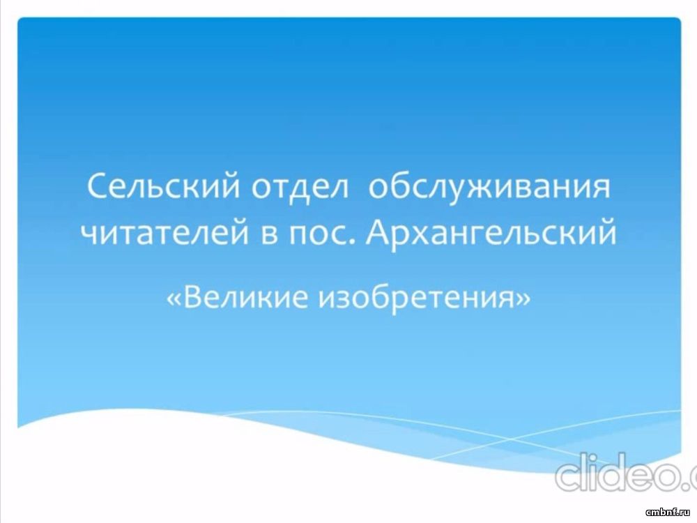 Библиотекарь сельского отдела обслуживания читателей п.Архангельский Елена Путилова представляет презентацию на тему «Великие изобретения».