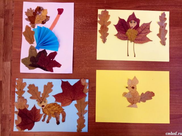 Собрав большое количество листочков, хорошенько засушив их, вооружившись клеем, бумагой, ножницами, ну и, конечно, хорошим настроением, ребята приступили к творческому процессу изготовления веселых аппликаций из осенних листьев, семян, трав, веточек. После долгих экспериментов получились прекрасные картины, на которых можно было увидеть и красавца-оленя в лесу, и павлина с шикарным хвостом, и маленькую белочку, и осенний букет…
