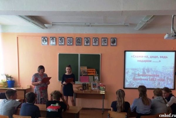 В начале мероприятия, посмотрев презентацию «Скажи-ка, дядя, ведь недаром...» ученики узнали, что на Бородинском поле состоялось генеральное сражение Отечественной войны 1812 года, которое положило начало разгрома армии Наполеона, о французском императоре Наполеоне I Бонапарте, армия которого без объявления войны вторглась в пределы Российской империи. О тяжелых кровопролитных боях наших войск против захватчиков. О великом русском полководце Кутузове Михаиле Илларионовиче, генерале Багратионе Петре Ивановиче, отважном кавалеристе Денисе Давыдове и многих других бесстрашных и отважных героях войны 1812 года.