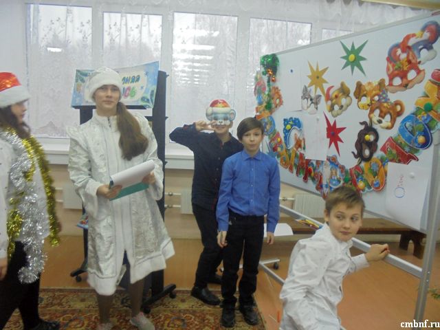 Зал украшен, на выставке - яркие книги на новогоднюю тематику. Конкурс « Новогодняя загадка», художники рисуют современного Деда Мороза, конкурс « Телеграмма Деду Морозу», где ребята проявили себя в знании красивейшего русского языка в части подбора прилагательных! Игра в «фанты», сценка « Пантомима на тему зимнего леса» заставила всех громко смеяться над исполнителями. Феерией праздника стал конкурс «Наряди снеговика», с морковками в зубах снеговики стойко переносили попытки украсить их мишурой. Все это сопровождалось новогодними песнями – хитами!