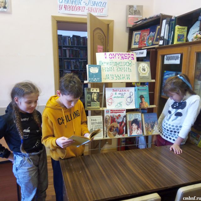 6 октября в сельском отделе обслуживания читателей (пос. Архангельский) прошло мероприятие «Загляни в мир музыки». Библиотекарь Елена Путилова рассказала ребятам об истории возникновения праздника - Международного дня музыки. Затем дети приняли участие в различных конкурсах: «Аукцион слов по нотам», «Угадай музыкальный инструмент», «Пантомима», «Угадай мелодию». Соревновались две команды, и победила та команда, которая набрала наибольшее количество значков-нот. К мероприятию была оформлена выставка «Загляни в мир музыки». Основным разделом выставки стала литература по истории музыки.