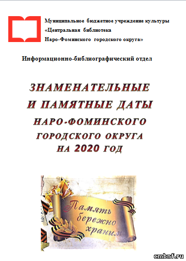 Календарь «Знаменательные и памятные даты Наро-Фоминского городского округа на 2020 год» предназначен в помощь библиотекарю при планировании работы на 2020 год. Также он будет полезен и интересен педагогам, организаторам, студентам, школьникам и всем, кого интересует прошлое и настоящее нашего края.